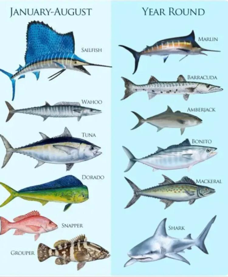 Itt megtalálható a nyársorrú halak legtöbb fajtája, úgy mint a kék marlin, a fekete marlin, a kardhal és fajtársaik; tonhalak, kutyafogú tonhalak, giant trevally, barrakuda, wahoo, dorado, amberjack, roosterfish, spanyol makréla, bikacápa, citromcápa és tigris cápa. Néha meg a „Nagy Fehér” is megmutatja magát.Továbbá grouper, snapper, red snapper, cubera snspper és tarpon. Igaz, sokkal kisebbek, mint az atlanti szomszédságban. Az offshore (BIG GAME) horgászat klasszikus halfajai itt egész évben foghatók, mint a kardhal, marlinfélék, a wahoo, a barrakuda, és természetesen néha cápára is számíthatunk